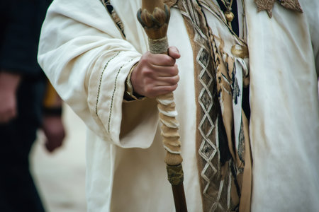 Close up of a high priest's hand gripping a sacred staff, adorned with intricate details, during a religious ceremony