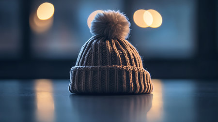 Generative AI Image of Cozy Knitted Winter Hat on Sleek Surface with Blurry Light Background