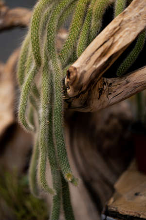 Natural mood cactus with long branches and hair thorns on a wooden snag.