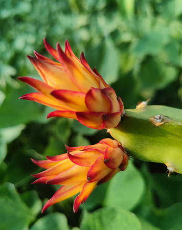 Blooming cactus with orange flowers and green leaves in the garden