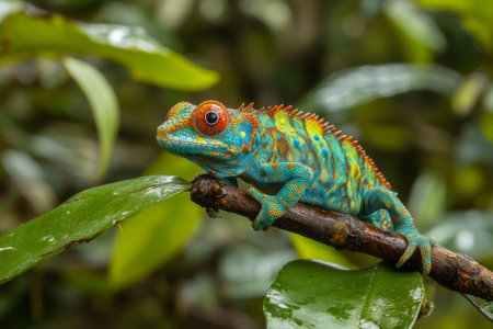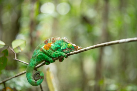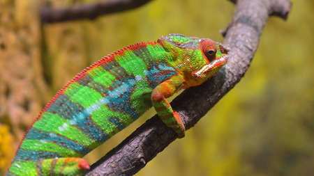Colorful Panther chameleon (furcifer pardalis) resting on a branch in natural environment.