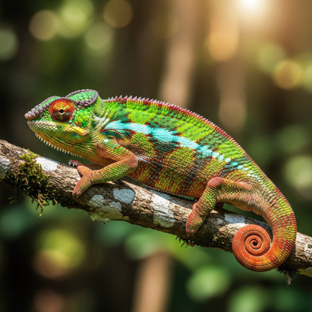 A colorful chameleon sits on a branch, showcasing its intricate patterns and hues as the warm sunlight filters through the leaves in the background.