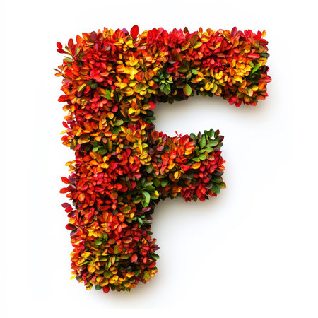 Alphabet letter F made of fall leaves, flowers. berries. Vibrant autumn colours. White clean background. Generative AI.