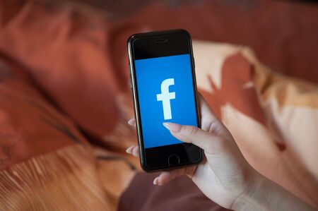 Saint-Petersburg / Russian Federation - 27 March 2019: Female hand with manicure holding cellphone with Facebook