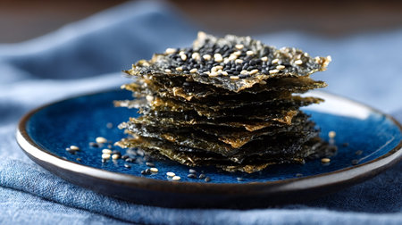 Roasted seaweed chips stacked on a vibrant blue plate, seasoned with white and black sesame seeds, offering a healthy and savory snack option from asian cuisine