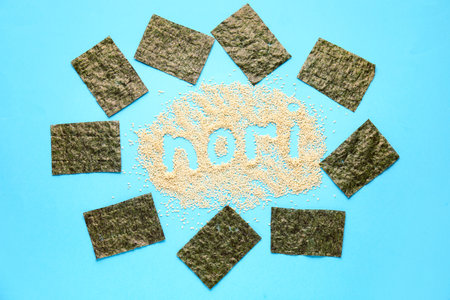 Word NORI made of sesame seeds and seaweed sheets on color background