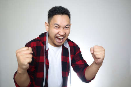 Angry young man screaming and clenching his fists in anger, isolated on white background