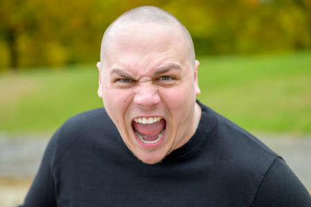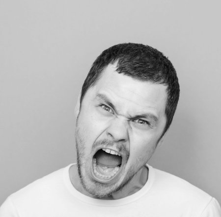 Close-up portrait of an angry adult male shouting with mouth wide open, eyes closed, and face expressing intense frustration and rage
