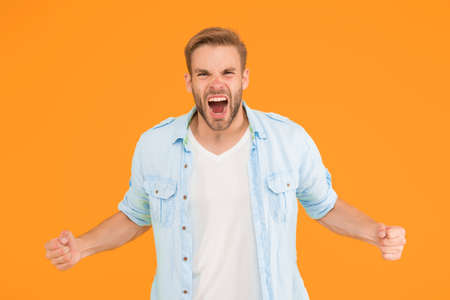 pure rage. negative human emotions. sexy boy with trendy hairstyle wear shirt. handsome unshaven man with bristle. male summer casual fashion style. angry guy has groomed hair shouting