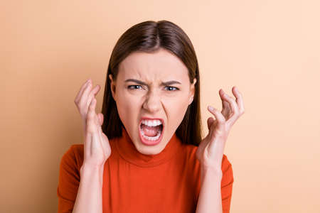 Close-up portrait of her she nice attractive crazy outraged gloomy frustrated wild desperate straight-haired girl expressing rage despair isolated over beige pastel color background