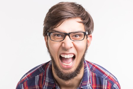Expression and gesture concept - Portrait of angry man screaming on white background