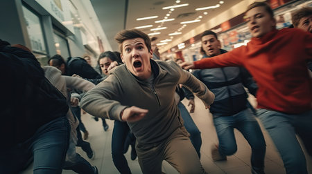 Frenzy Black Friday shoppers running inside shopping mall, crowd of people while shopping during seasonal sales. Diverse people customers rushing for bargains, hunting for discounts, doorbuster