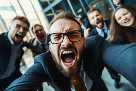 Business man in suit and glasses screaming into camera white taking selfie in office. Group of people is celebrating success