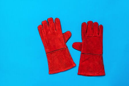 Work gloves on blue wooden background. top view