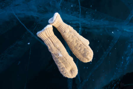 winter mittens lie on transparent ice