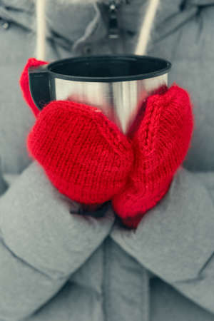 Close-up of female hands in Canada mittens hold a red thermal cup.