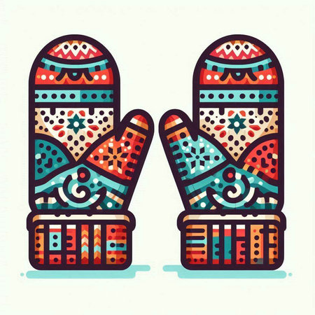 Hand drawn vector illustration of winter mittens. Colorful ethnic patterned background.