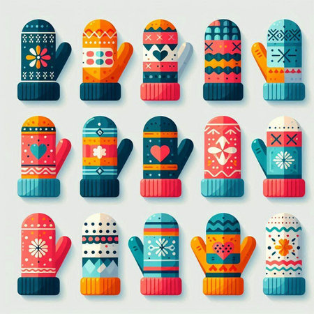 Set of knitted mittens with different patterns. Vector illustration.