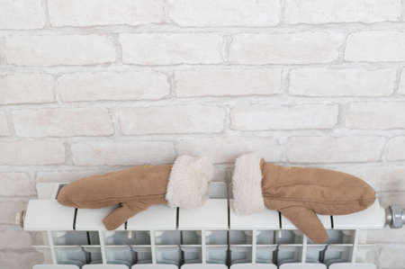 Childs knitted gloves drying on heating radiator after winter day outside