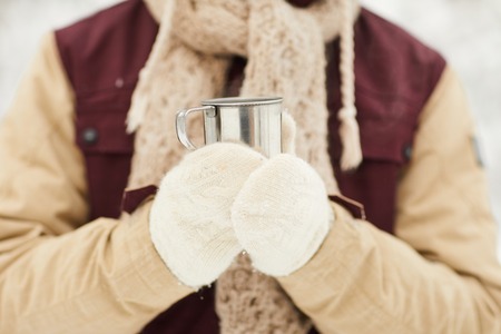 hands in red mittens holding a cup of tea