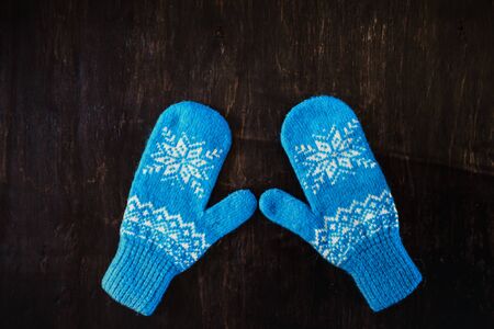 a pair of blue knitted mittens on a dark blue-green-brown wooden vintage background, copy space.