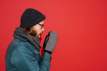 Ginger man wearing hat and jacket trembling and feeling cold isolated over red background