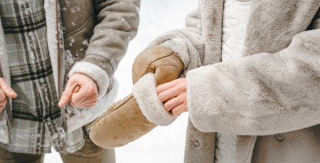 Love romantic young couple. Guy girl with frozen hands in mittens in snowy winter forest. Walking,having fun Stylish clothes,fur coat,jacket,woolen shawl. snow love story. Romantic date,weekend.