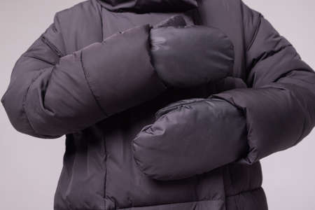 One hand in white mitten isolated on a light background. Copy space.