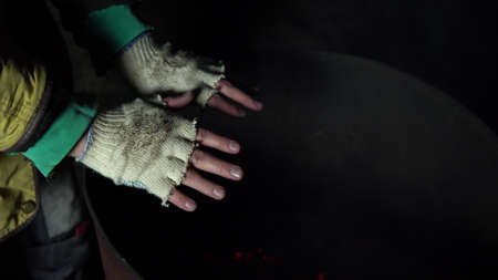 A homeless man warms his hands at night near a barrel of fire. Hands close up.