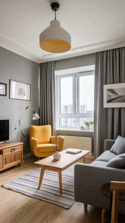 Wide-angle modern living room scene in cozy apartment, highlighting simple furniture, neutral hues, and abundant sunlight for relaxed home vibes