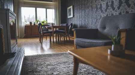 Photograph of an elegant living room with a gray sofa, armchair, and coffee table. The walls have a dark wallpaper. In the background, you can see a dining area in a light wood color. There is a carpet on the floor. --chaos 30 --ar 16:9 --v 6.1 Job ID: 43204111-0247-4938-98cd-c70846b2aaca