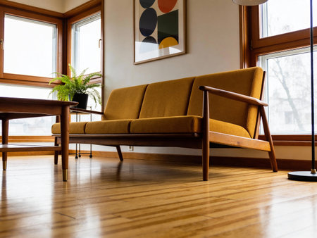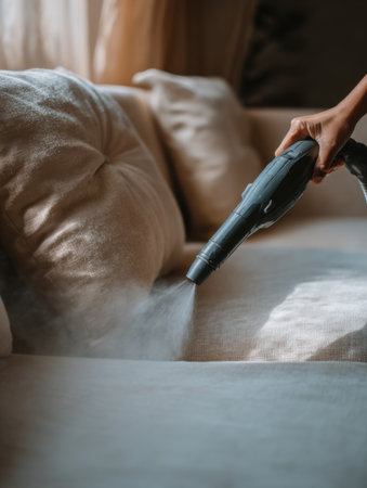 A person is using a handheld vacuum cleaner to remove dust and debris from a sofa in a warm and inviting living room filled with natural light.