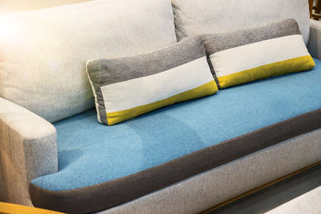 Close-up of modern colorful sofas and two pillows