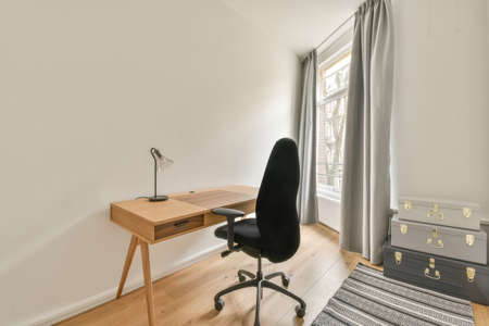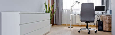 Modern home office with window, white commode, comfortable chair, desk, and computer