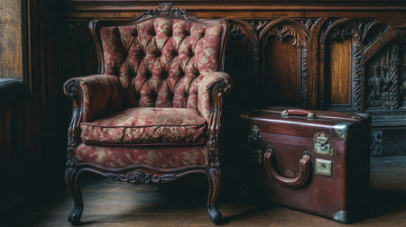 A vintage upholstered armchair featuring a rich red floral pattern is placed next to a classic leather suitcase, creating an inviting and elegant atmosphere in a beautifully designed room.