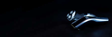 Shaving, Razor, brush, Comb, scissor, clippers and hair trimmer. Accessories for Barber shop equipment on black background Top view copyspace