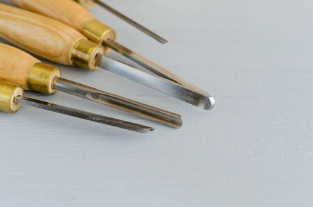 used wood lathe chisels on the wooden table.