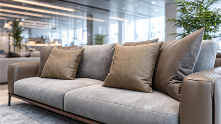 A modern gray sofa with brown pillows in a stylish living room with plants and large windows