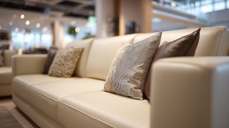 A modern cream-colored leather sofa with decorative pillows in a furniture store showroom