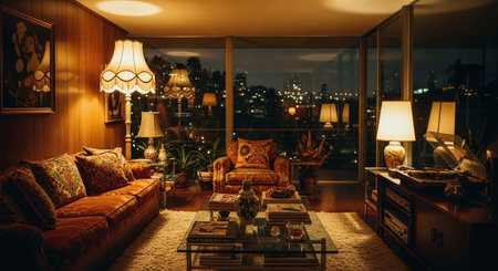 A cozy, vintage living room at night with warm lighting, featuring a floral-patterned sofa, a glass coffee table, and large windows showcasing a city skyline