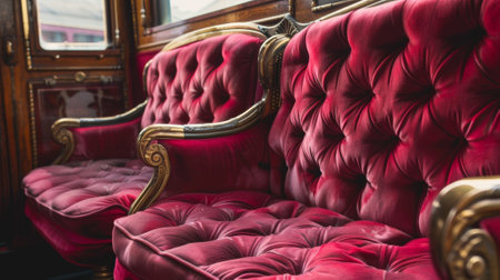 A closeup of the vintage train car interior with plush red velvet seats and brass detailing on the windows and doors