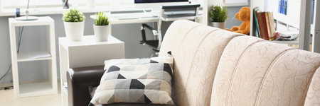 Cozy home interior, sofa with working place and laptop, fresh renovation