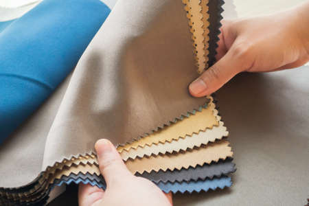 female designer with fabric color samples choosing textile for curtains
