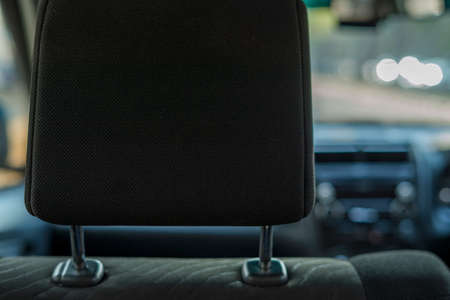 Hand adjusts headrest in car interior. adjusting the seat position in the car