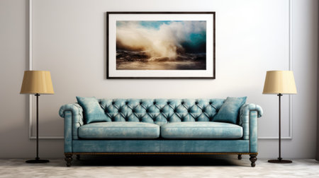 Interior of modern living room with blue sofa 3D render illustration