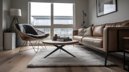 Living room decor, home interior design . Scandinavian Minimalist style with Large Window decorated with Wood and Metal material . Generative AI AIG26.