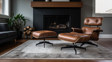 Interior design of Living Room in Mid-Century Modern style with Large fireplace decorated with Patterned rug, leather chair material. Mid-century modern architecture. Generative AI AIG24.