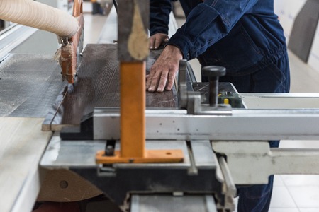 Furniture production or craft concept: worker sawing the wood surface of furniture part with saw machine
