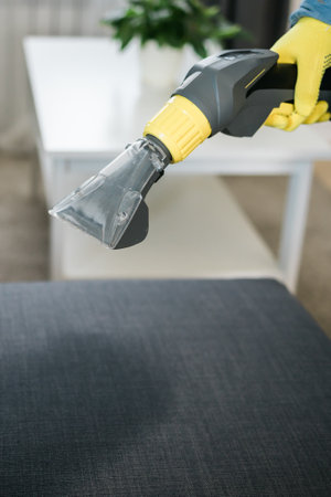 Cleaning service company employee removing dirt from furniture in flat with professional equipment. Man arm cleaning sofa with washing vacuum cleaner close up
