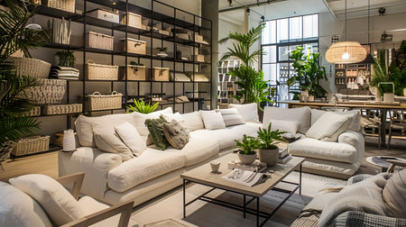 Experience a harmonious blend of contemporary elegance and natural vitality in this Scandinavian-inspired interior design store. Featuring stylish white sofas, wooden furniture, and an abundance of